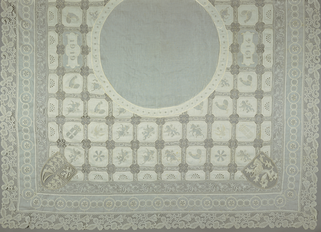 This is a Cover. It is dated 1919 and we acquired it in 1974. Its technique is embroidery, needle and bobbin lace. It is a part of the Textiles department.