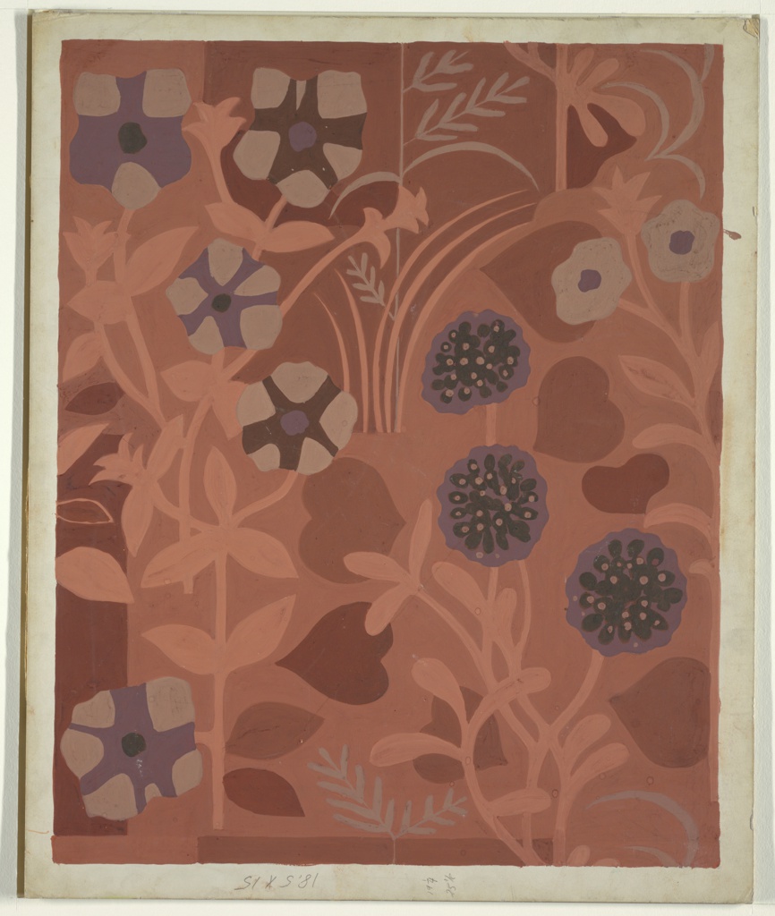 Drawing, Textile Design: Floral Motif, Rust; Donald Deskey (American, 1894–1989); USA; brush and gouache, graphite on off-white illustration board; 50.9 x 41.7 cm (20 1/16 x 16 7/16 in.) Mat: 71.1 x 55.9 cm (28 x 22 in.); Gift of Donald Deskey; 1975-11-36