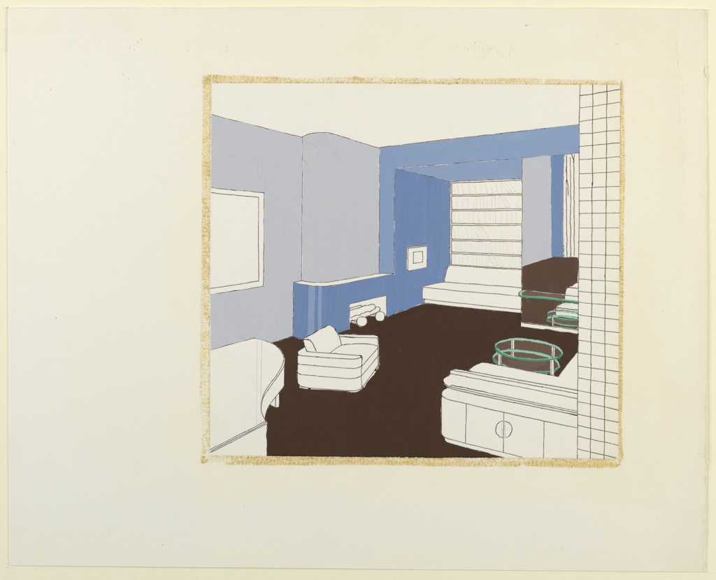 Drawing, Design for Living Room, Frederick and Emily Gash Apartment, 305 West 57th Street, New York, NY; Designed by Donald Deskey (American, 1894–1989); USA; brush and blue and green gouache, pen and brush and black ink, graphite on illustration board; 30.4 x 40.5 cm (11 15/16 x 15 15/16 in.); Gift of Donald Deskey; 1975-11-7