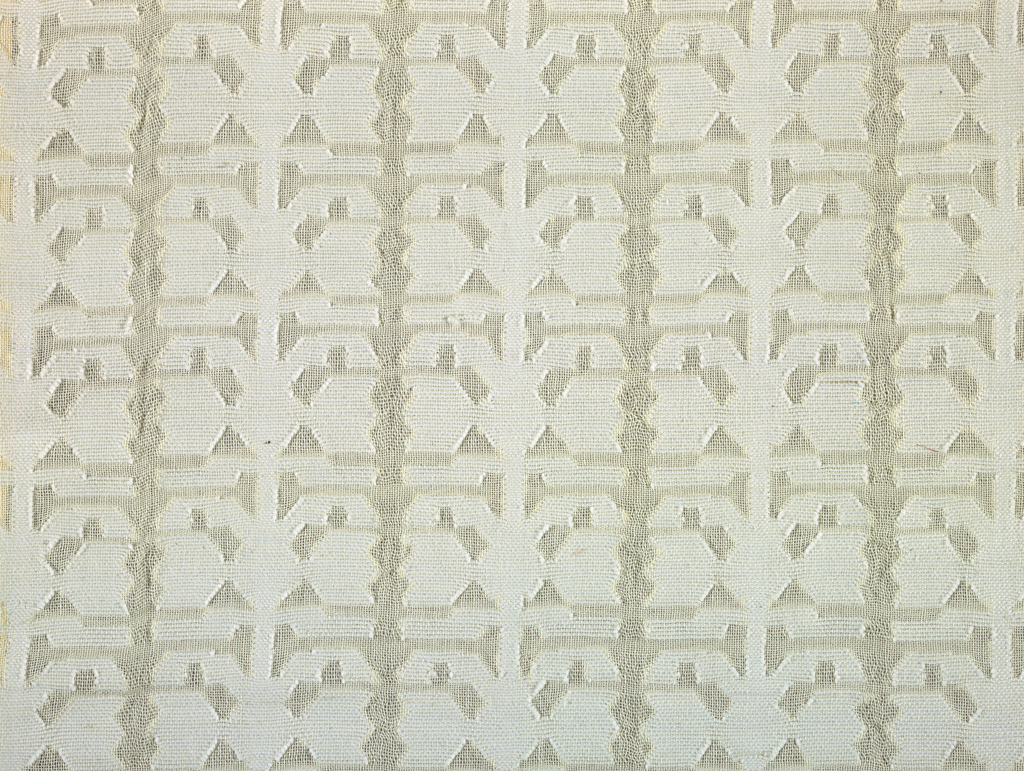 This is a Sample. It was designed by Isabel Scott and manufactured by Isabel Scott Fabrics. It is dated 1970–75 and we acquired it in 1975. Its medium is cotton and its technique is continuous supplementary weft in a plain weave foundation free floating on one face or laid in the foundation weave; floats have been cut away by hand leaving a pattern which is denser than the foundation fabric. It is a part of the Textiles department.