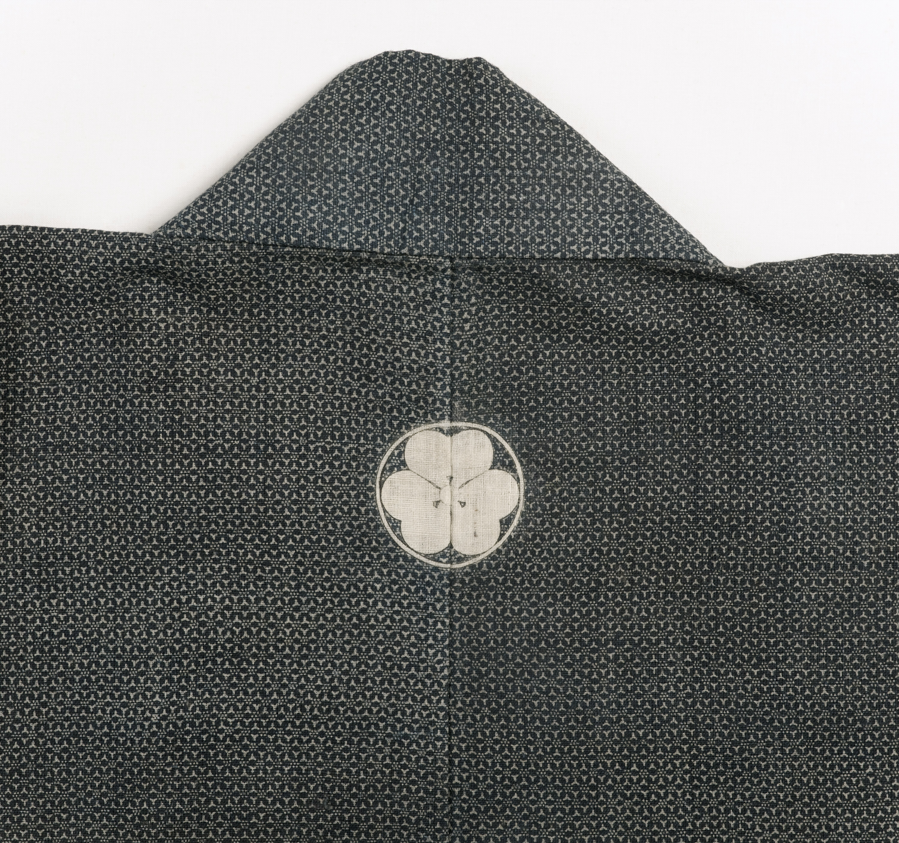 The delicate floral and geometric pattern that decorates this kimono is so fine as only to be revealed through close examination. Tiny stencil patterns like these, called komon, evoke samurai aesthetics of restraint, and were once worn only by warriors and the nobility. Some families even had exclusive rights to certain patterns. The large stylized floral designs added at the shoulders are feudal family crests.