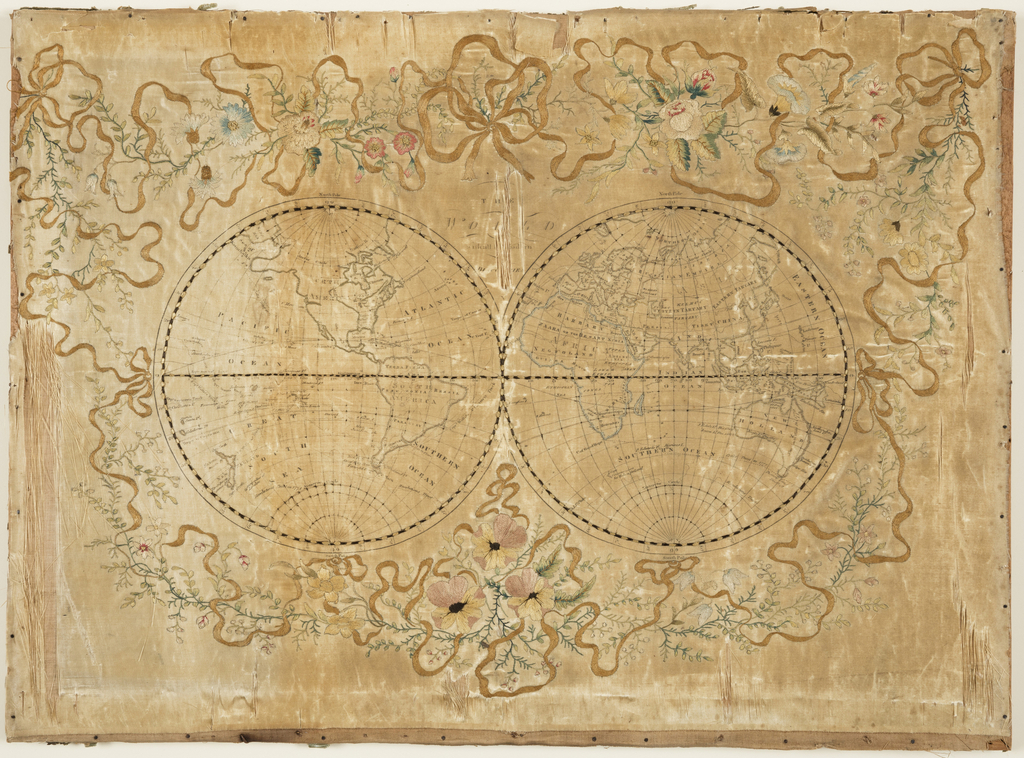 This is a Map sampler. It is dated late 18th century and we acquired it in 1976. Its medium is silk on silk and its technique is stem, chain, satin, running and knot stitches on 8-harness satin foundation which the globes were printed; uncounted stitches. It is a part of the Textiles department.