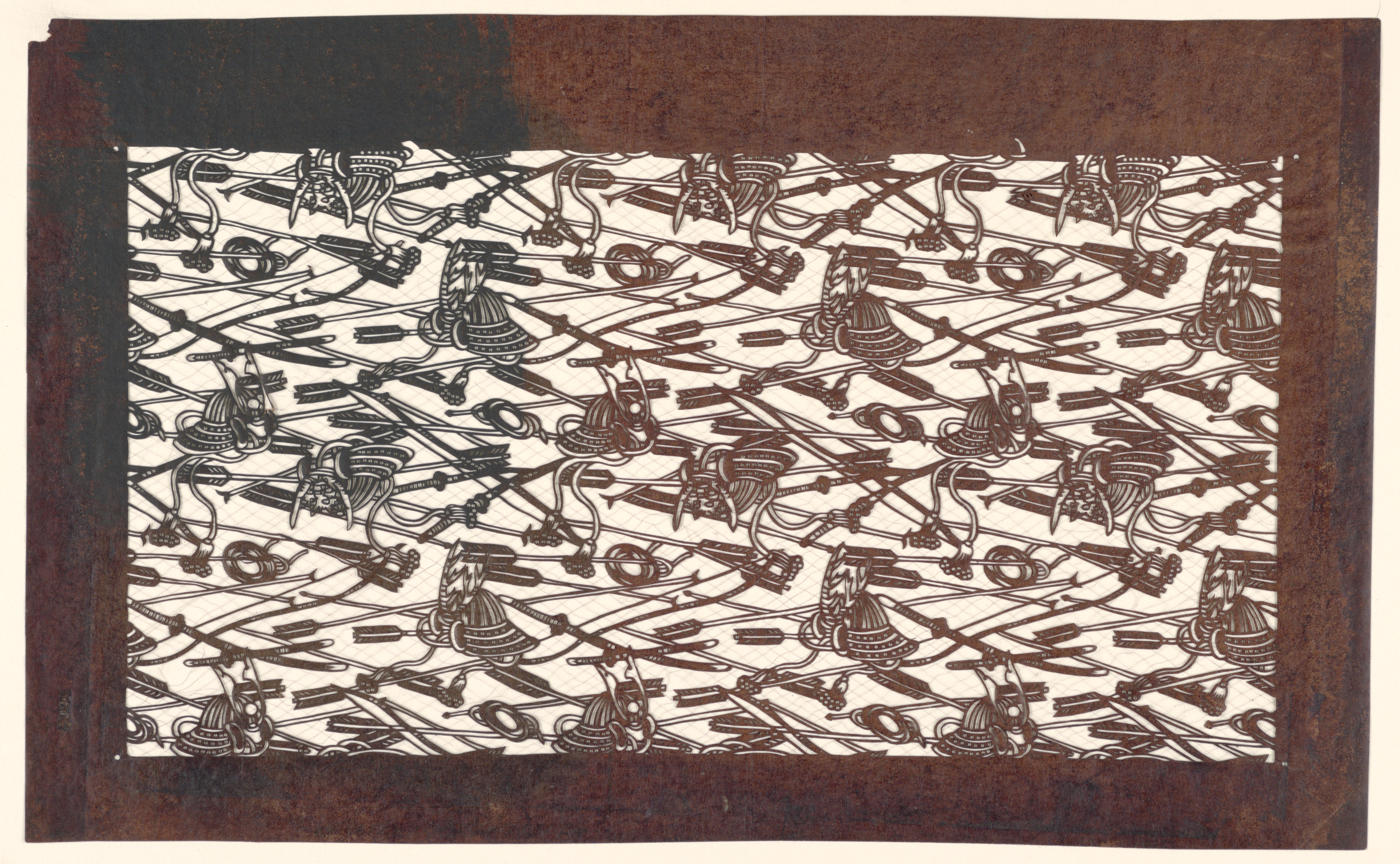 Katagami, Helmets, Swords, Bows and Arrows; Japan; mulberry paper (kozo washi) treated with fermented persimmon tannin (kakishibu), and silk threads (itoire); 26.1 × 42.5 cm (10 1/4 × 16 3/4 in.) Mat: 35.5 × 45.6 cm (14 × 17 15/16 in.); Gift of Helen Snyder; 1976-103-94