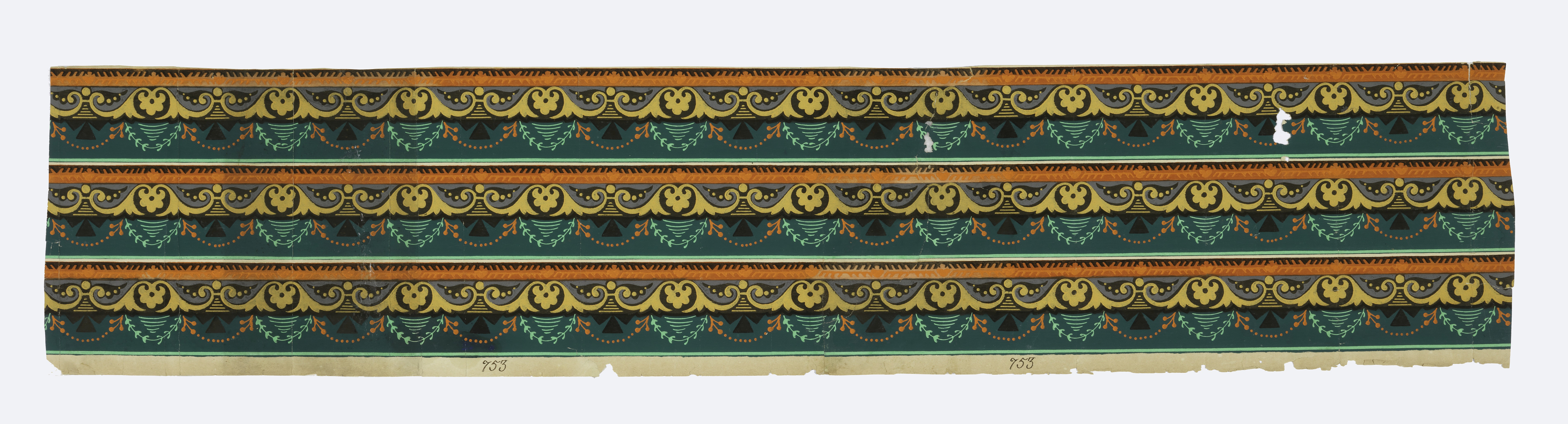 This is a Border. It is dated 1850–1900 and we acquired it in 1976. Its medium is block-printed. It is a part of the Wallcoverings department.