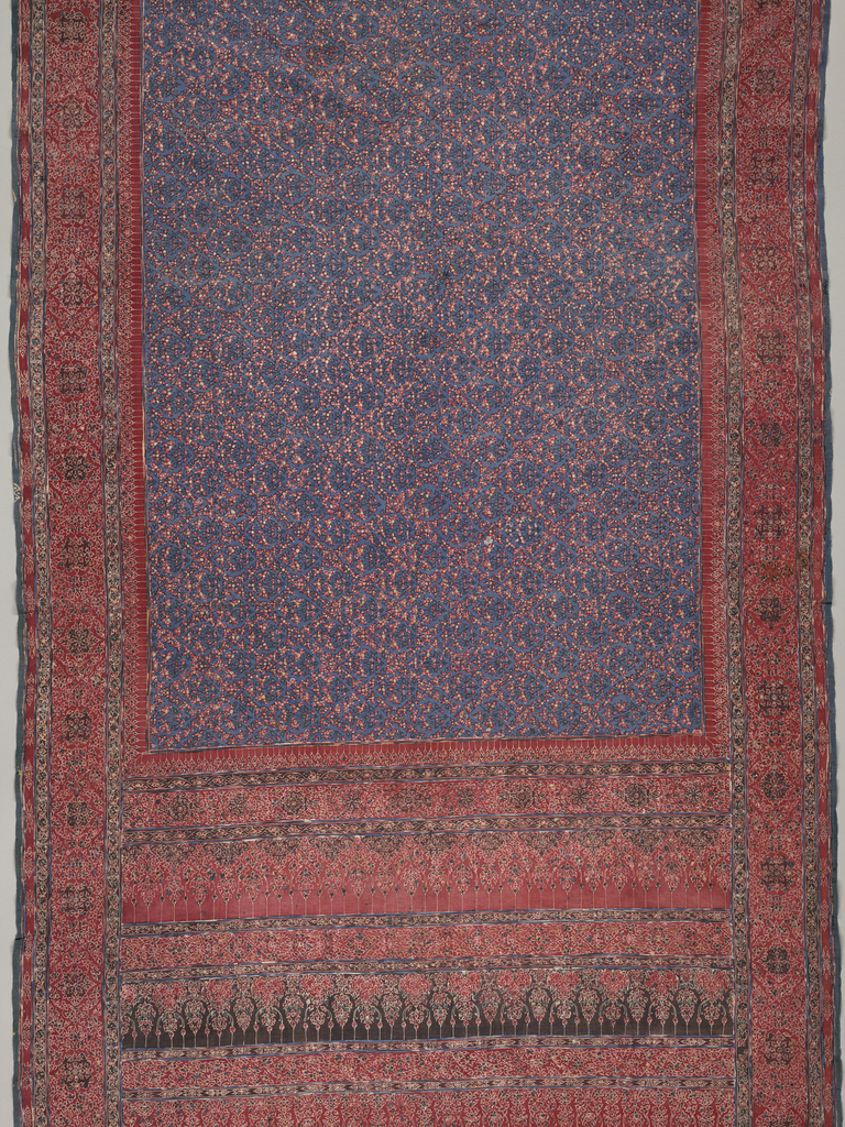 This is a Sarong. It is dated 19th–20th century and we acquired it in 1976. Its medium is cotton and its technique is plain weave; application of mordants and resist by hand held implement for reds and blues; yellow probably supplied directly by brush; technique very close to if not the same for "chintz" dyed in india. It is a part of the Textiles department.