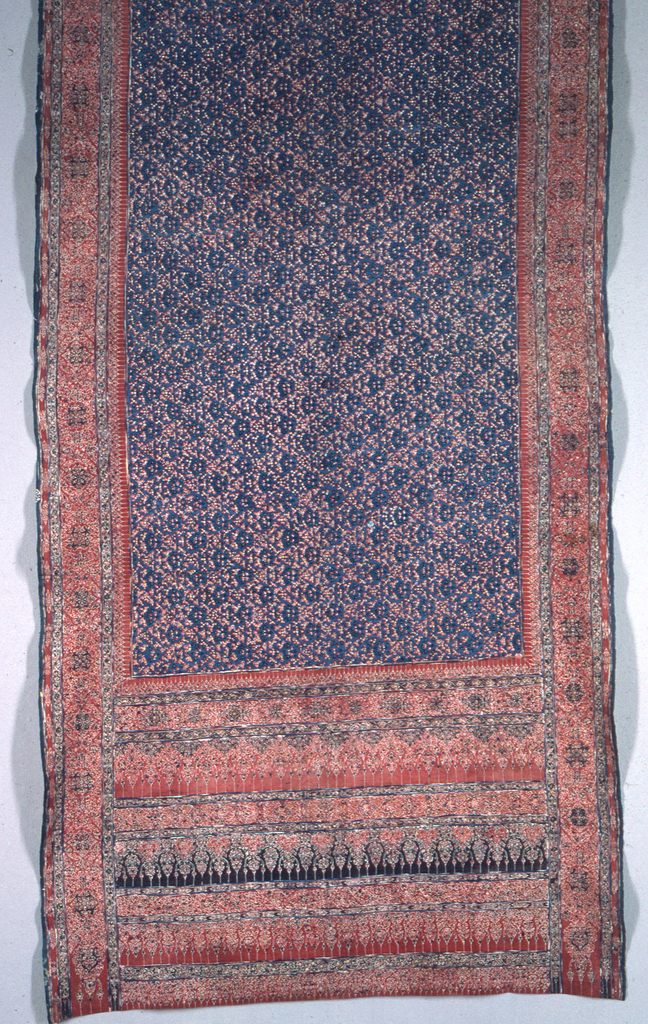 This is a Sarong. It is dated 19th–20th century and we acquired it in 1976. Its medium is cotton and its technique is plain weave; application of mordants and resist by hand held implement for reds and blues; yellow probably supplied directly by brush; technique very close to if not the same for "chintz" dyed in india. It is a part of the Textiles department.