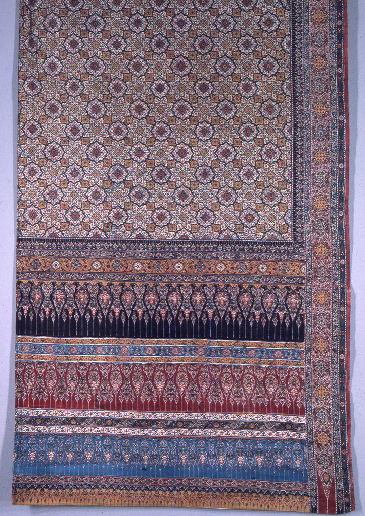 This is a Sarong. It is dated 18th century and we acquired it in 1976. Its medium is cotton and its technique is plain weave. application of mordants and resist by hand held implement for reds and blue; yellow probably applied directly by brush. technique very close if not same as for "chintz" dyed in india. It is a part of the Textiles department.
