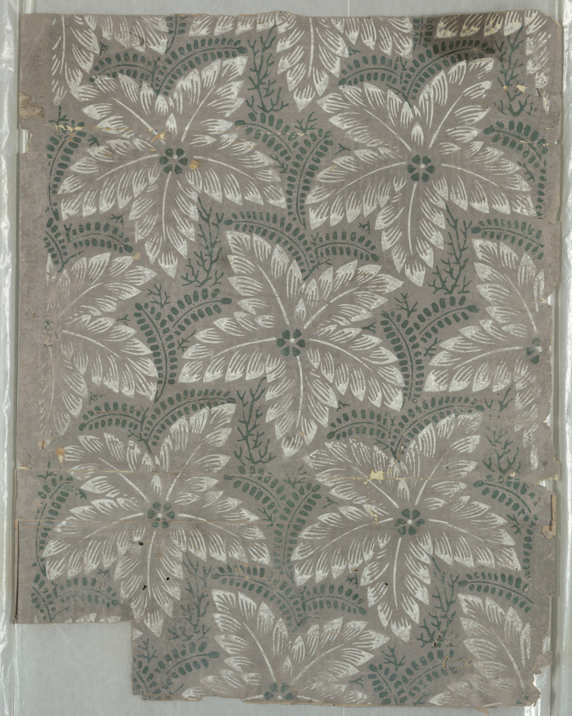 This is a Sidewall and label. It is dated 1820–30 and we acquired it in 1976. Its medium is block-printed on handmade paper. It is a part of the Wallcoverings department.