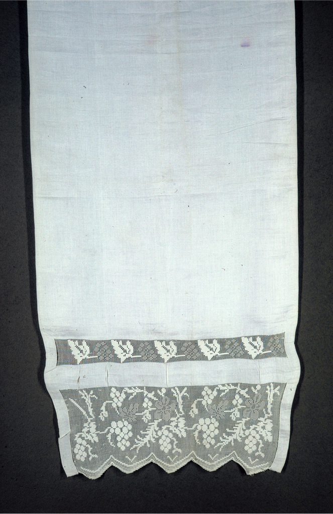 This is a Table scarf. It is dated ca. 1900 and we acquired it in 1976. Its medium is linen and its technique is withdrawn element with darned motifs. It is a part of the Textiles department.