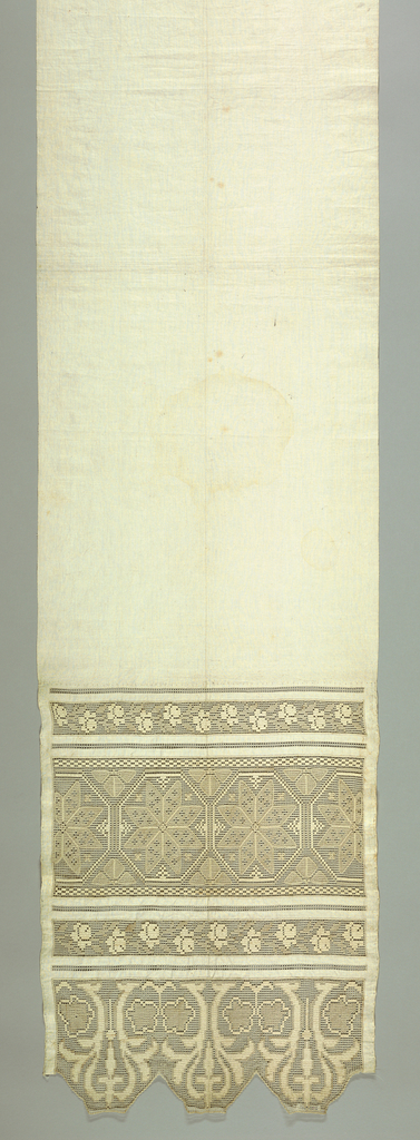 This is a Table scarf. It is dated ca. 1900 and we acquired it in 1976. Its medium is linen and its technique is plain weave and withdrawn element with darned motifs. It is a part of the Textiles department.
