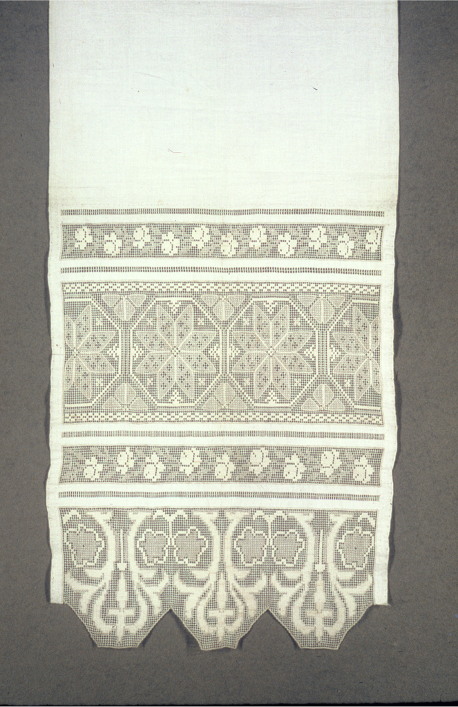This is a Table scarf. It is dated ca. 1900 and we acquired it in 1976. Its medium is linen and its technique is plain weave and withdrawn element with darned motifs. It is a part of the Textiles department.