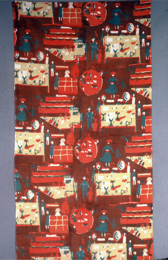 This is a Textile. It was made by Florence Klodko and student at The Educational Alliance. It is dated 1930s and we acquired it in 1976. Its medium is cotton and its technique is hand screen printed on plain weave. It is a part of the Textiles department.
