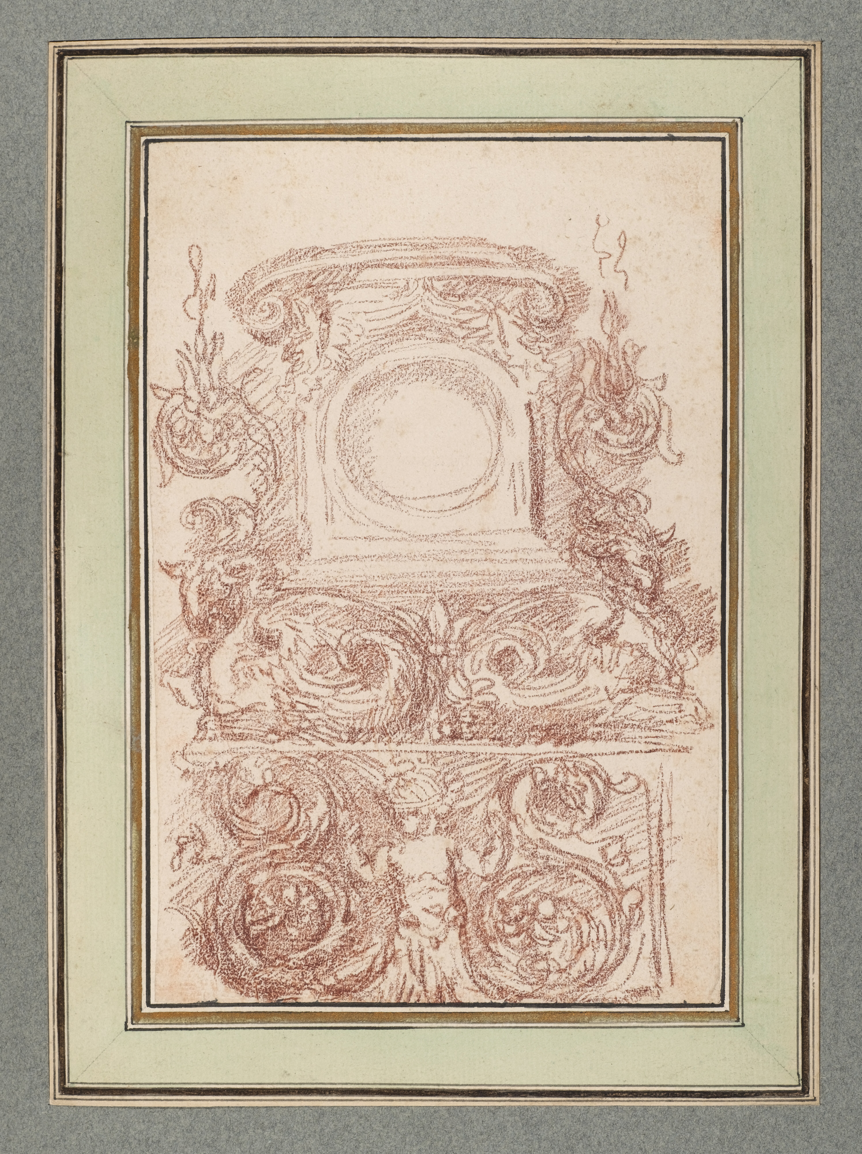 Bound Drawing, Frame with Blank Oval, and Elaborate Foliage Scroll Decoration, in Dessins d'Ango Ornements et Architecture (Drawings of Ornaments and Architecture by Ango); Jean-Robert Ango (French, active in Rome 1759 –1770, d. 1773); France; red chalk on cream laid paper; 21.5 x 14.8 cm (8 7/16 x 5 13/16 in.); Gift of Noah Butkin; 1977-110-4-19
