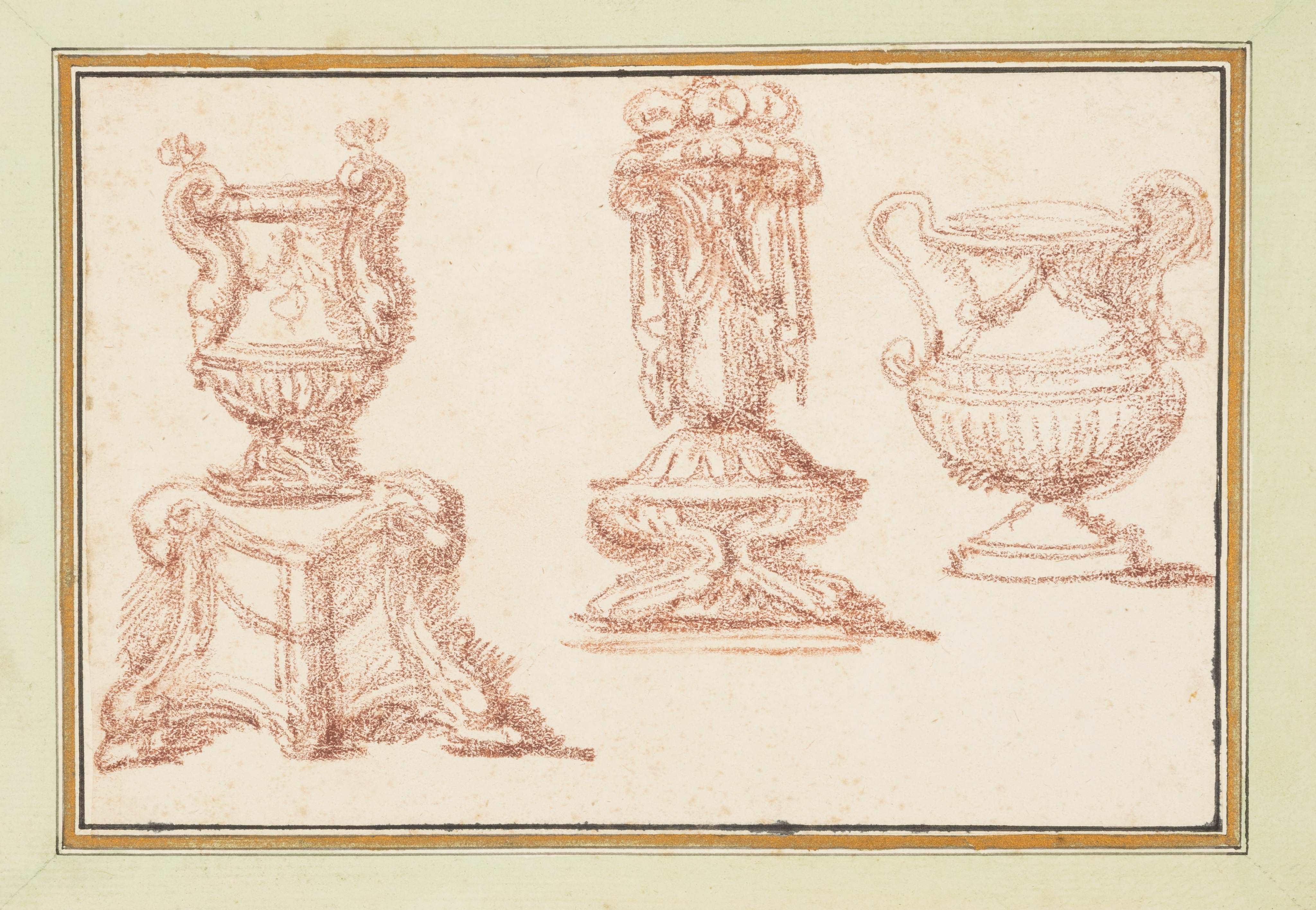 Drawing, Three urns; Jean-Robert Ango (French, active in Rome 1759 –1770, d. 1773); France; red chalk on paper; Gift of Noah Butkin; 1977-110-4-28