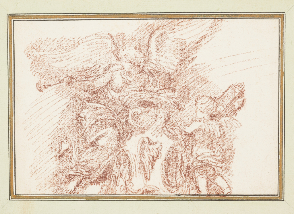 Drawing, Winged figure with a horn and putto with fasces; Jean-Robert Ango (French, active in Rome 1759 –1770, d. 1773); France; red chalk on paper; Gift of Noah Butkin; 1977-110-4-41
