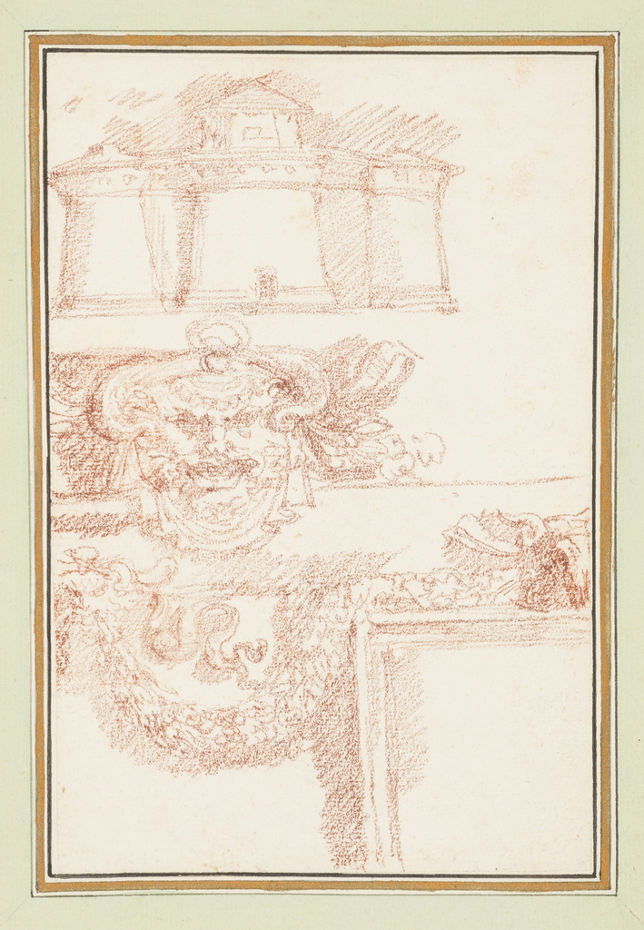 Drawing, Armory, mask and a garland; Jean-Robert Ango (French, active in Rome 1759 –1770, d. 1773); France; red chalk on paper; 1977-110-4-5
