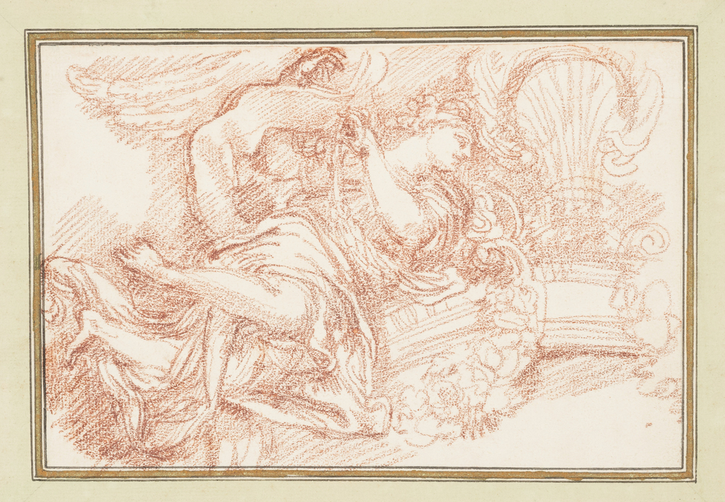Drawing, A Stucco Angel from the Nave Vault, Church of the Gesu, Rome," from the album "Drawings after Ornament and Architecture"; Jean-Robert Ango (French, active in Rome 1759 –1770, d. 1773); After Giovanni Battista Gaulli, called Baciccio (Italian, 1639 - 1709), Ercole Antonio Raggi, called il Lombardo (Italian, 1624 - 1686); France; red chalk on paper, mounted to a larger sheet with multiple framing lines, then inset into a secondary sleeve mount; 1977-110-4-9