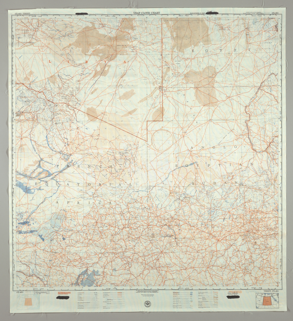 This is a Escape map. It is dated 1950 and we acquired it in 1977. Its medium is synthetic (?) and its technique is printed on plain weave. It is a part of the Textiles department.