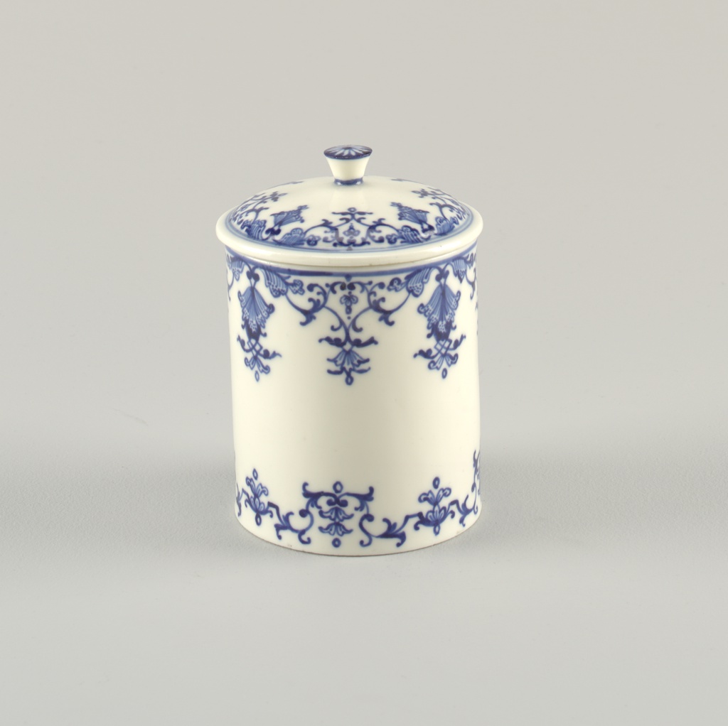 This is a Jar. It was manufactured by Saint-Cloud Porcelain Manufactory. It is dated ca. 1730 and we acquired it in 1977. Its medium is soft paste porcelain, vitreous enamel. It is a part of the Product Design and Decorative Arts department.