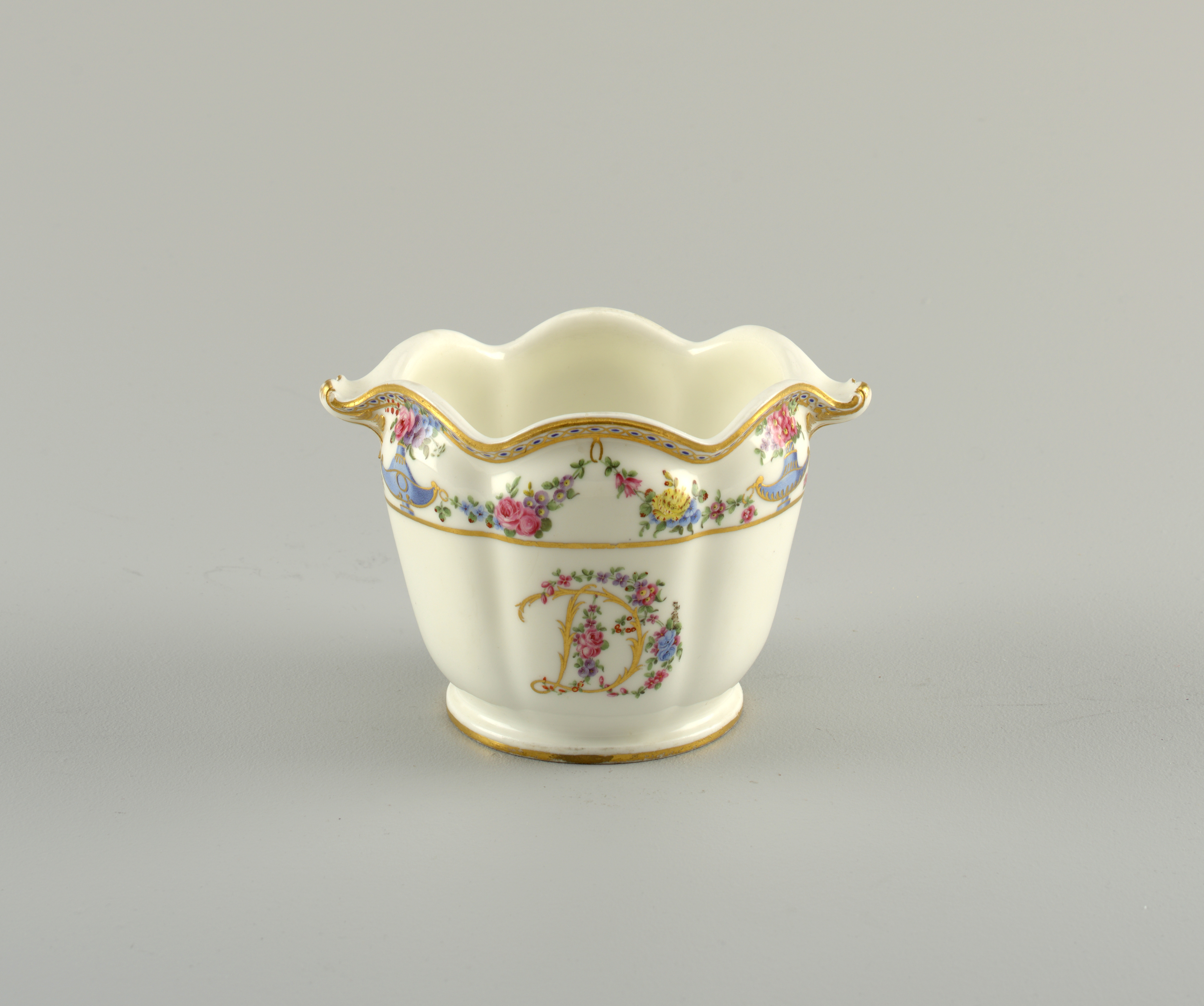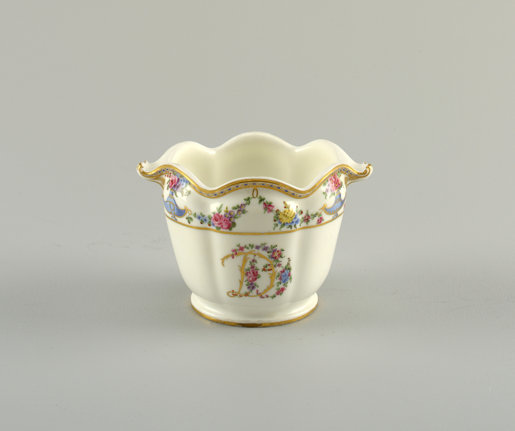 This is a coolers. It was manufactured by Sèvres Porcelain Manufactory and painted by Nicolas Catrice and Jean-Nicolas Le Bel (le jeune, later le père). It is dated 1771 and we acquired it in 1977. Its medium is soft paste porcelain, vitreous enamel, gold. It is a part of the Product Design and Decorative Arts department.