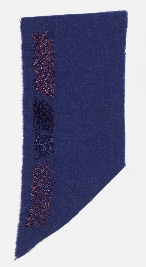 This is a Embroidery sample. It is dated 1930s and we acquired it in 1977. Its medium is wool, glass beads, rhinestones and its technique is embroidery on plain weave. It is a part of the Textiles department.