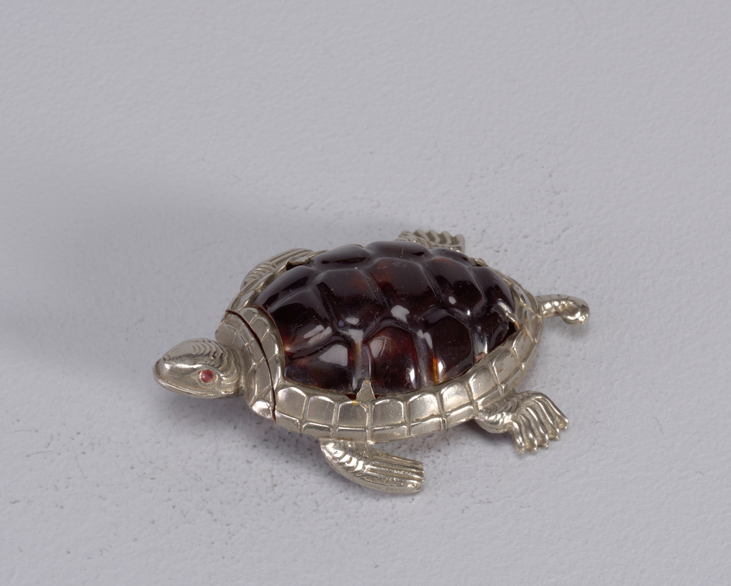 Turtle Matchsafe; Manufactured by T. Johnson; England; plated brass, celluloid, enamel; 5.9 x 4.9 x 1.4 cm (2 5/16 x 1 15/16 x 9/16 in. ); Gift of Stephen W. Brener and Carol B. Brener; 1978-146-128