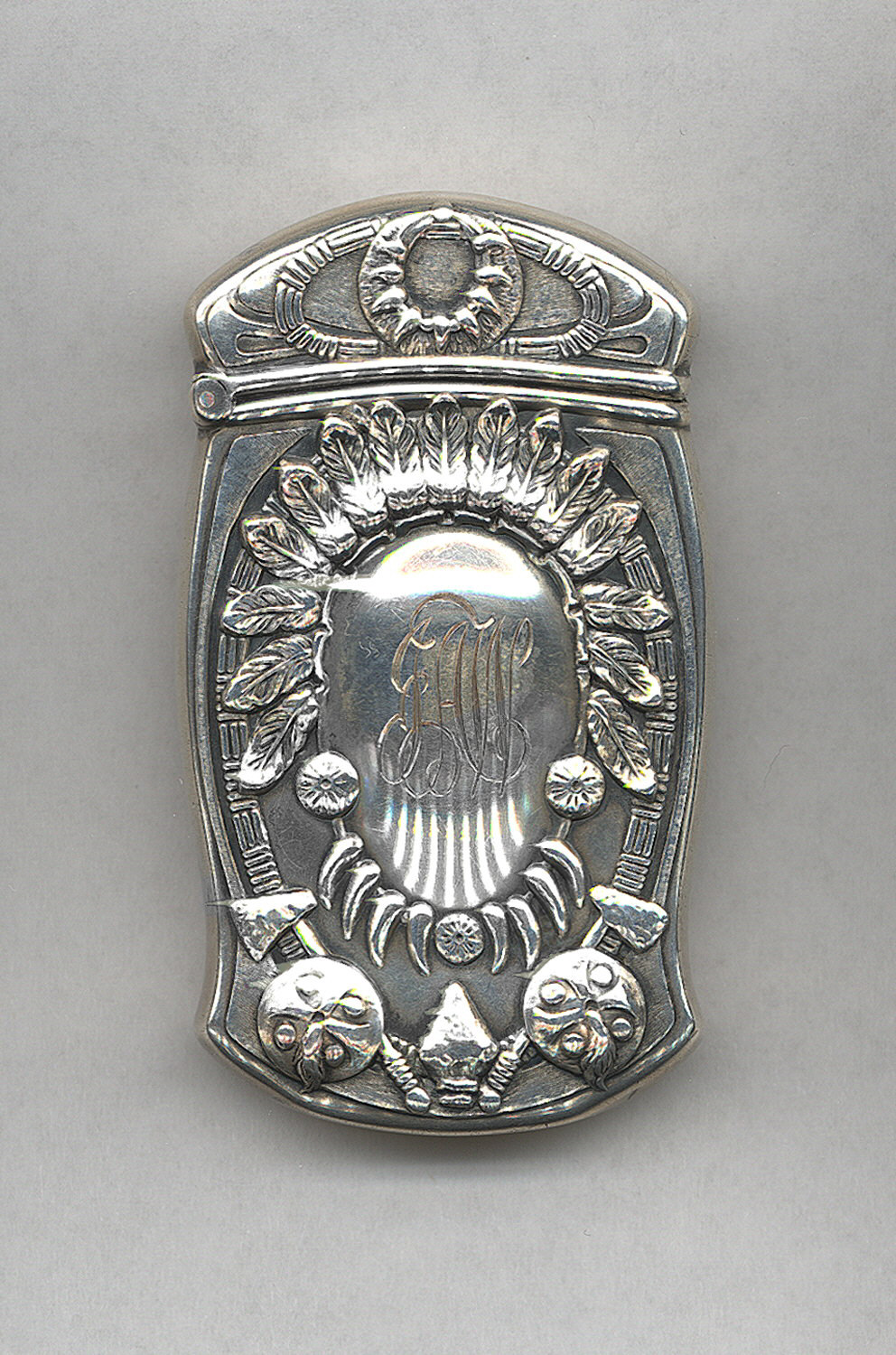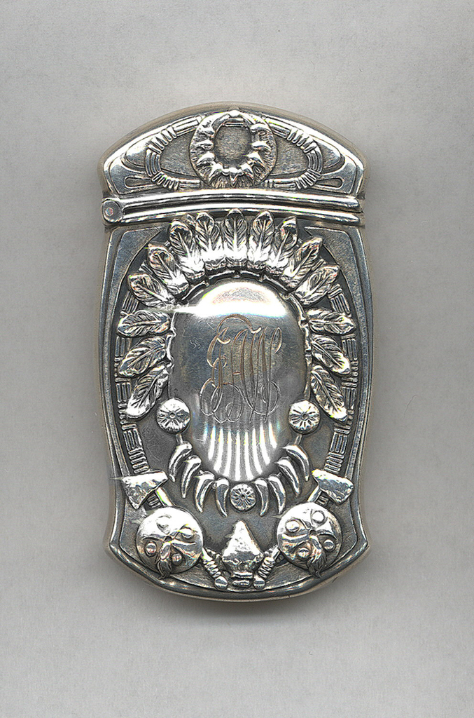 Native American Motifs Matchsafe; Manufactured by Gorham Manufacturing Company (United States); USA; silver; 7.2 x 4.2 x 1.2 cm (2 13/16 x 1 5/8 x 1/2 in. ); Gift of Stephen W. Brener and Carol B. Brener; 1978-146-1395