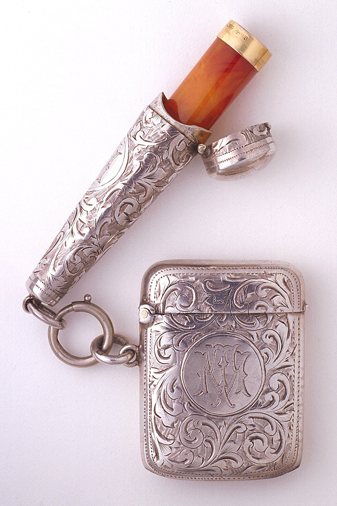 Cigarette Holder and Case Matchsafe; England; silver, plastic, gold; 4.8 x 3.7 x 1 cm (1 7/8 x 1 7/16 x 3/8 in. ); Gift of Stephen W. Brener and Carol B. Brener; 1978-146-795-a/c