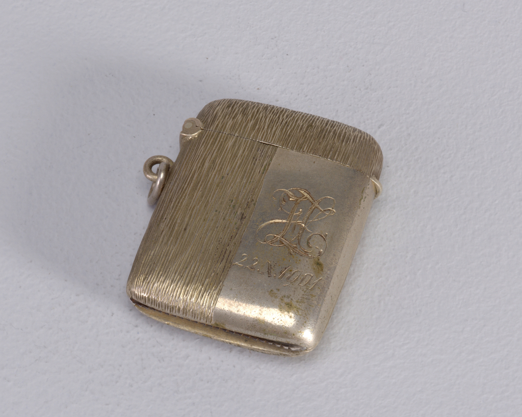 This is a Matchsafe. We acquired it in 1978. Its medium is silver. It is a part of the Product Design and Decorative Arts department.