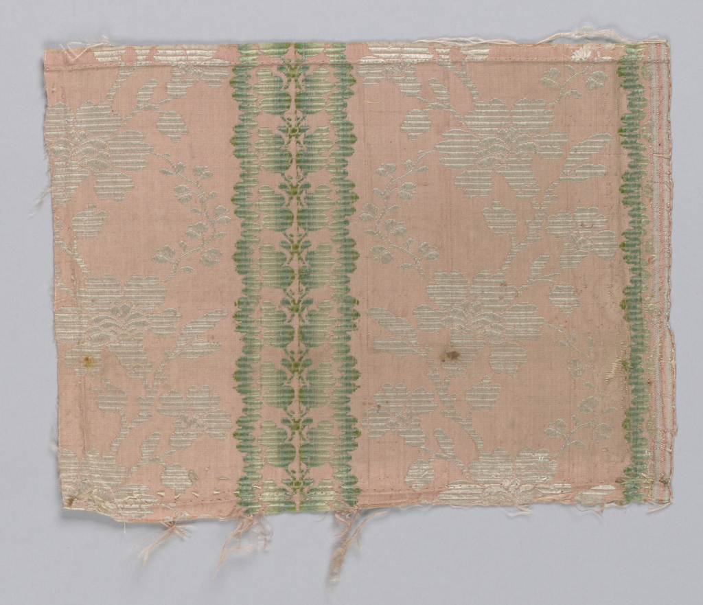This is a Fragments. It is dated 1750–99 and we acquired it in 1978. Its medium is silk and its technique is plain weave [rose red] patterned by floats of a supplementary warp [striped white and shades of green]. It is a part of the Textiles department.