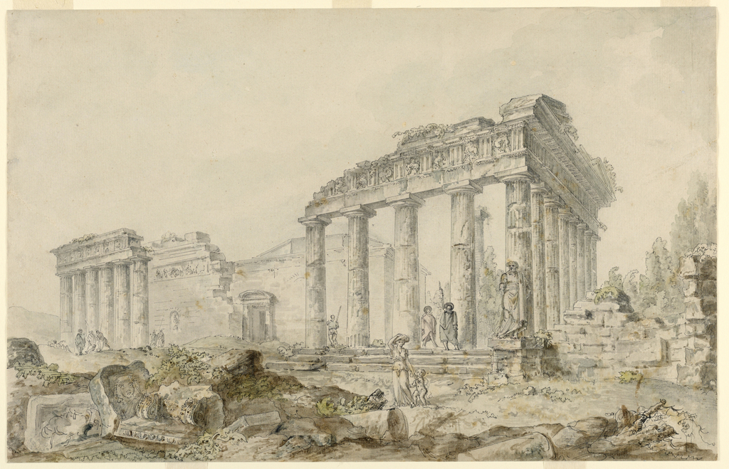 Drawing, Temple of Minerva, Athens, Greece; Hubert Robert (French, 1733 – 1808); France; pen and black ink, brush and brown, green, and gray wash on white laid paper, laid down; H x W: 28 × 43.8 cm (11 in. × 17 1/4 in.); Gift of Mrs. Howard J. Sachs and Mr. Peter G. Sachs in memory of Miss Edith L. Sachs; 1978-168-39