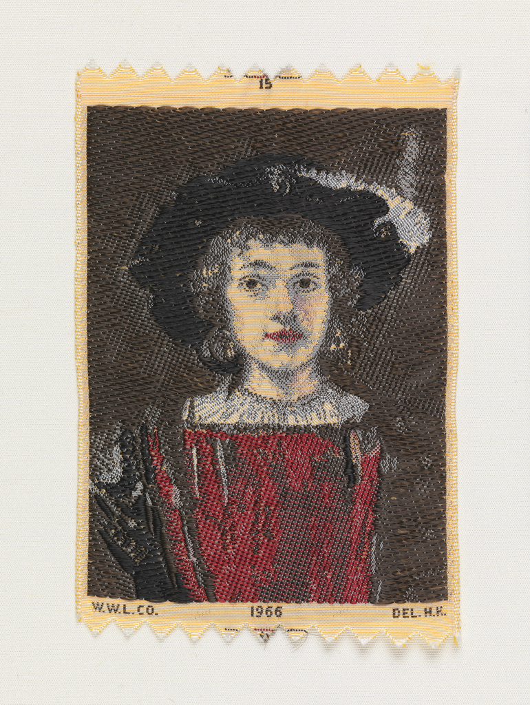 Souvenir Ribbon Portrait, Portrait of a Boy in Fancy Dress or Titus (c. 1655) by Rembrandt van Rijn (1606-1669); Manufactured by Warner-Artex; USA; silk; Warp x Weft: 10.5 x 7 cm (4 1/8 x 2 3/4 in.); Gift of Lisa Taylor; 1978-175-13