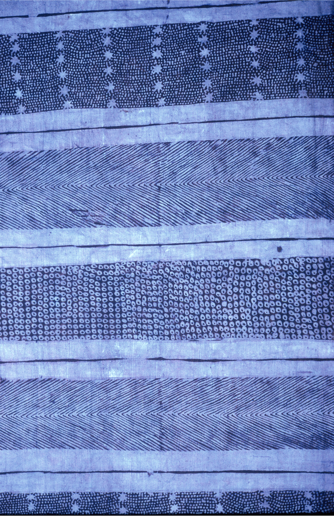 This is a Wrapper. It is dated late 20th century and we acquired it in 1979. Its medium is cotton and its technique is factory-woven plain weave, hand-applied cassava paste resist, indigo-dyed (adire). It is a part of the Textiles department.