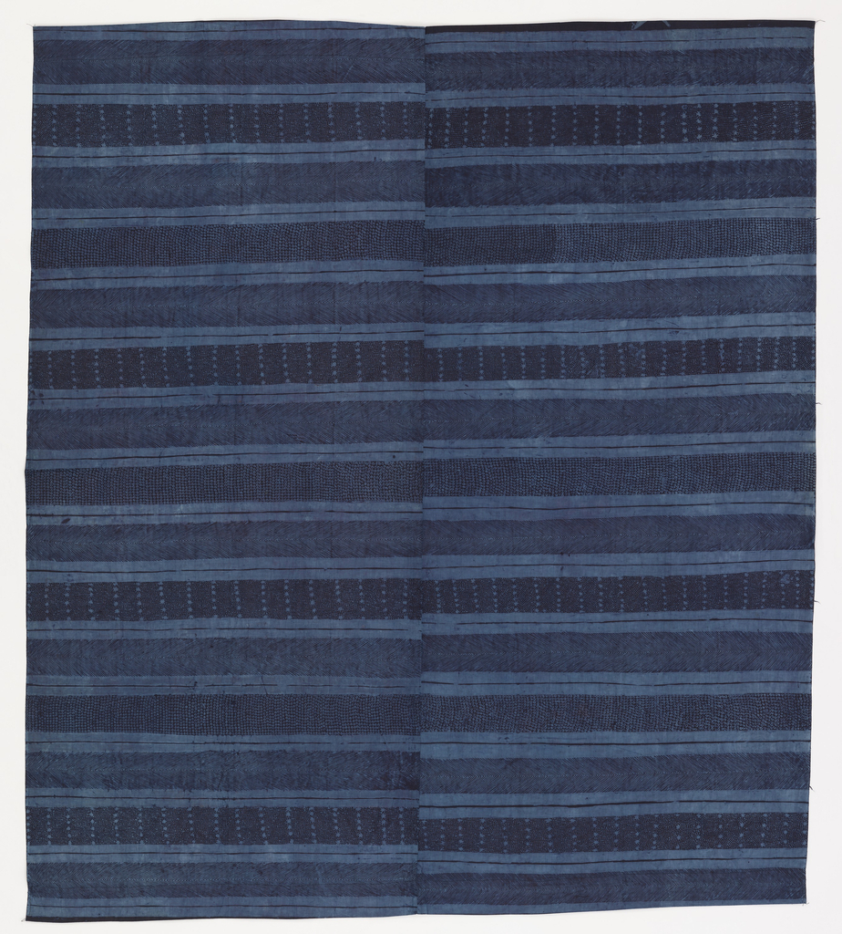 This is a Wrapper. It is dated late 20th century and we acquired it in 1979. Its medium is cotton and its technique is factory-woven plain weave, hand-applied cassava paste resist, indigo-dyed (adire). It is a part of the Textiles department.