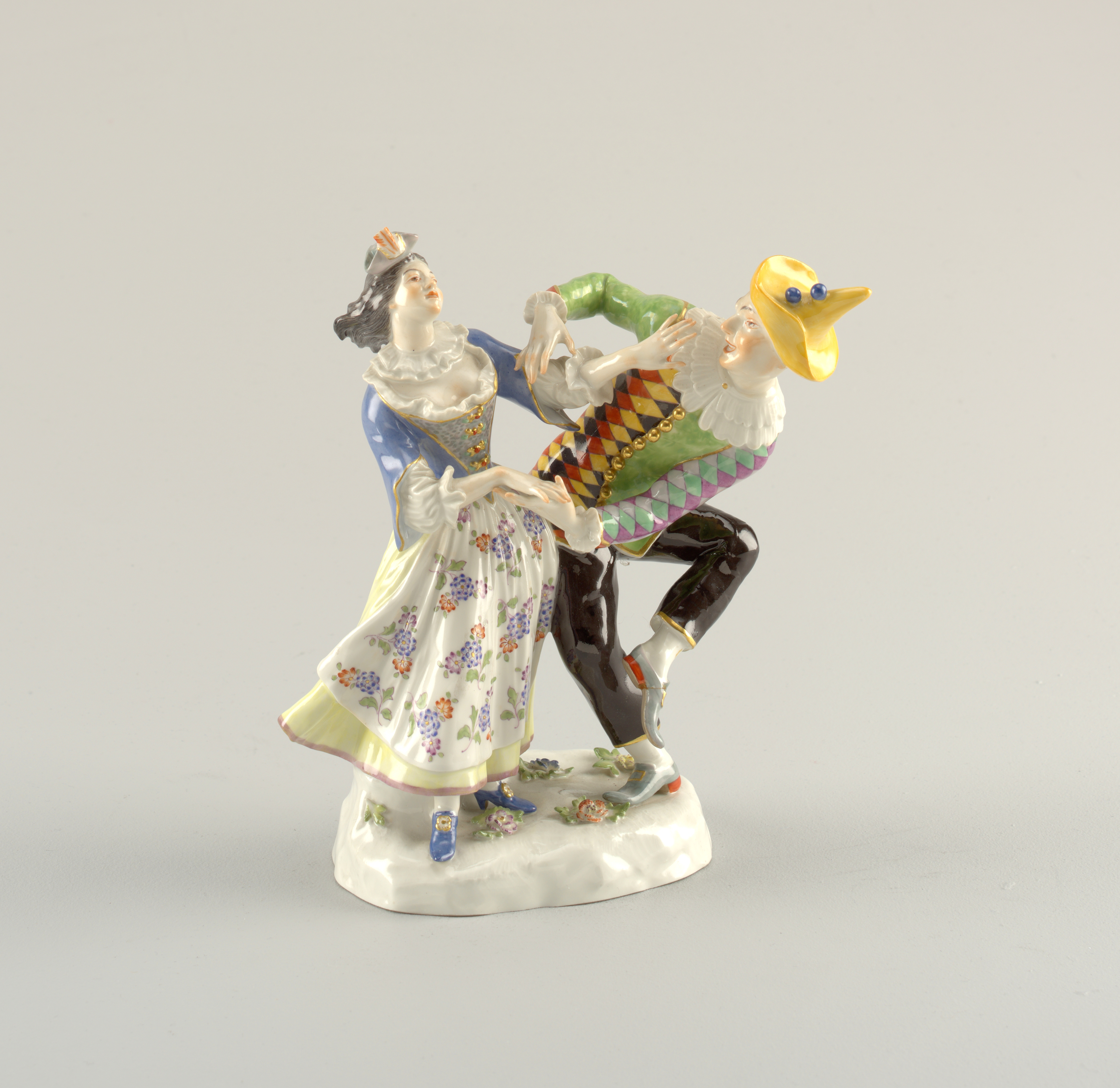 Figure of Harlequin Dancing with Columbine Figure; Modeled by Johann Friedrich Eberlein (1696 – 1749); Manufactured by Meissen Porcelain Manufactory (Germany); hard paste porcelain, vitreous enamel, gold; H x W x D: 22.8 × 17 × 10 cm (9 in. × 6 11/16 in. × 3 15/16 in.); 1979-83-1