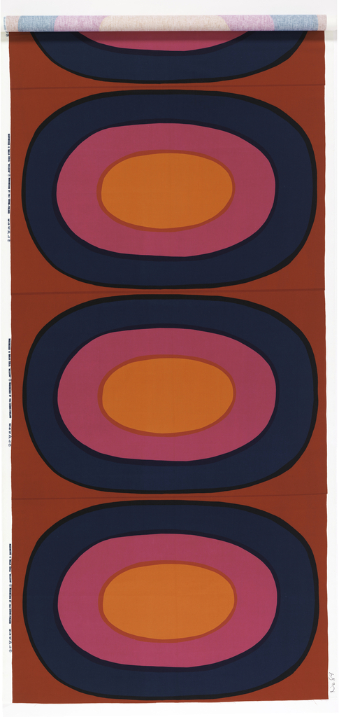 This is a Textile. It was designed by Maija Isola and manufactured by Marimekko Oy. It is dated 1963 and we acquired it in 1979. Its medium is cotton and its technique is screen printed on plain weave. It is a part of the Textiles department.