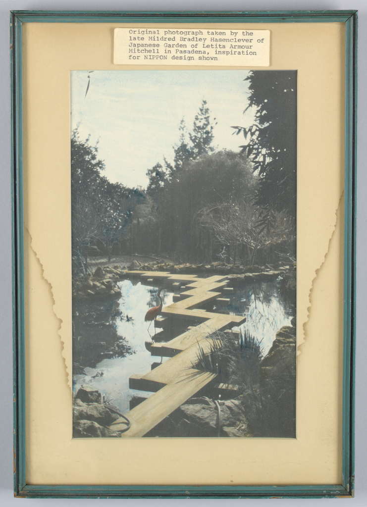 Textile, Nippon; Company: F. Schumacher & Co. (United States); USA; cotton; H x W x D (a): 32.5 x 22.5 x 1.3 cm (12 13/16 x 8 7/8 x 1/2 in.) Warp x Weft (b): 104 x 91.5 cm (40 15/16 x 36 in.) Warp x Weft (c): 104 x 91.5 cm (40 15/16 x 36 in.) Repeat H (pattern): 52.1 cm (20 1/2 in.); Gift of Mrs. R. Curt Hasenclever; 1979-9-39-a/c