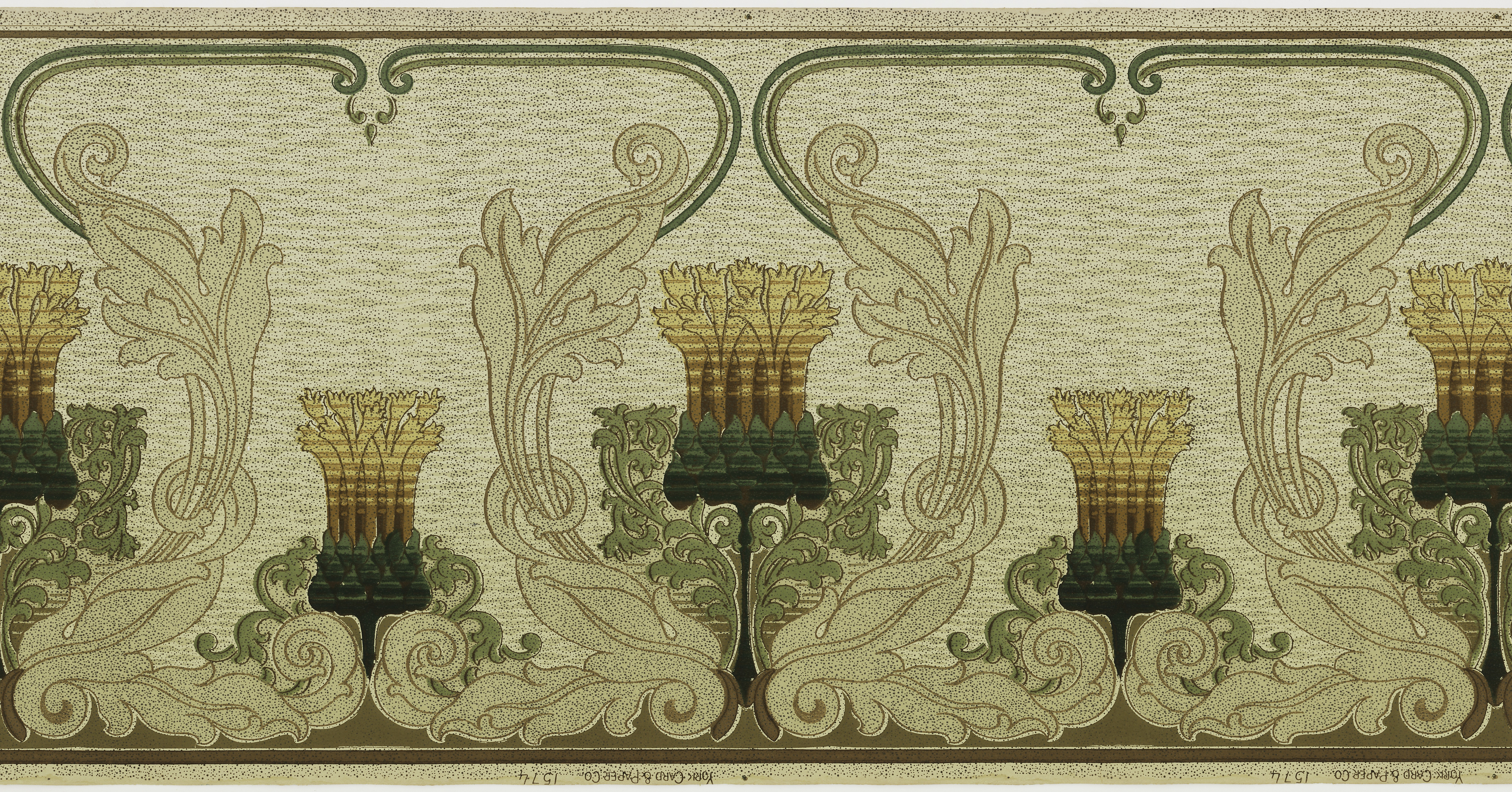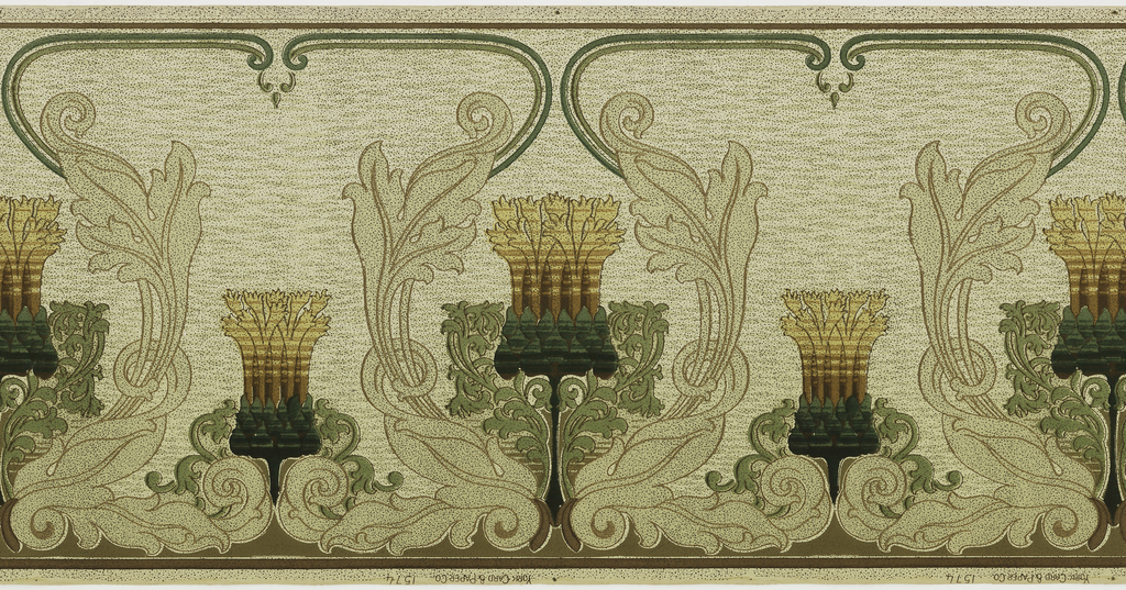 This is a frieze. It was manufactured by York Card & Paper Co.. It is dated 1905–1915 and we acquired it in 1979. Its medium is machine-printed paper. It is a part of the Wallcoverings department.