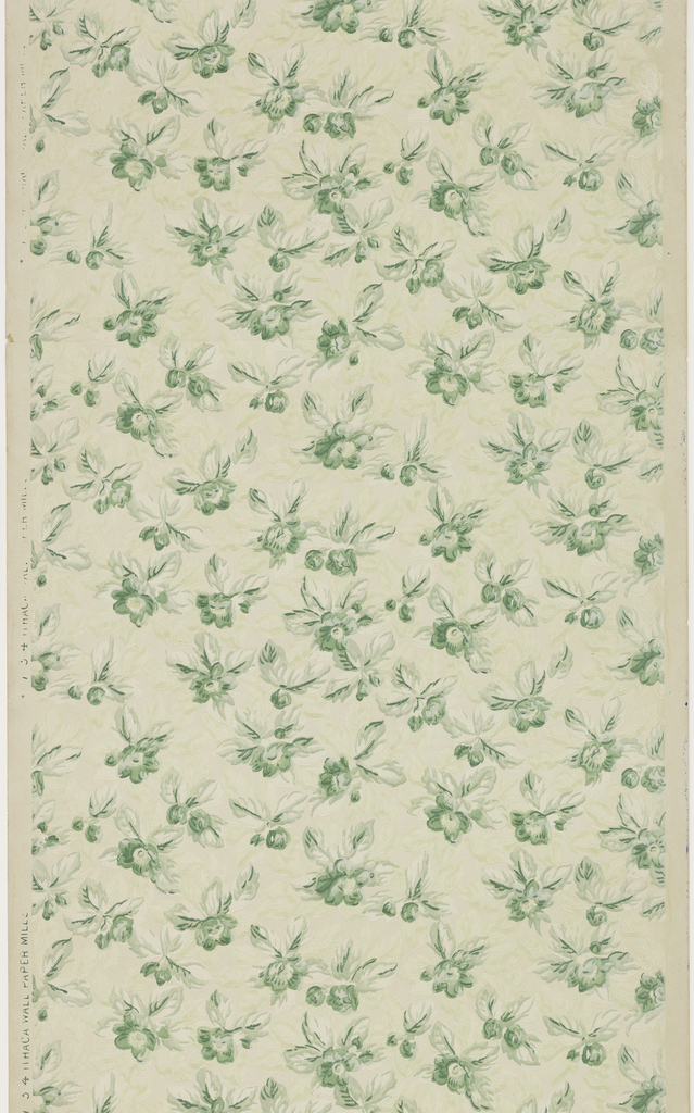 This is a Sidewall. It was manufactured by Ithaca Wallpaper Mills. It is dated 1905–1915 and we acquired it in 1979. Its medium is machine-printed paper, liquid mica. It is a part of the Wallcoverings department.