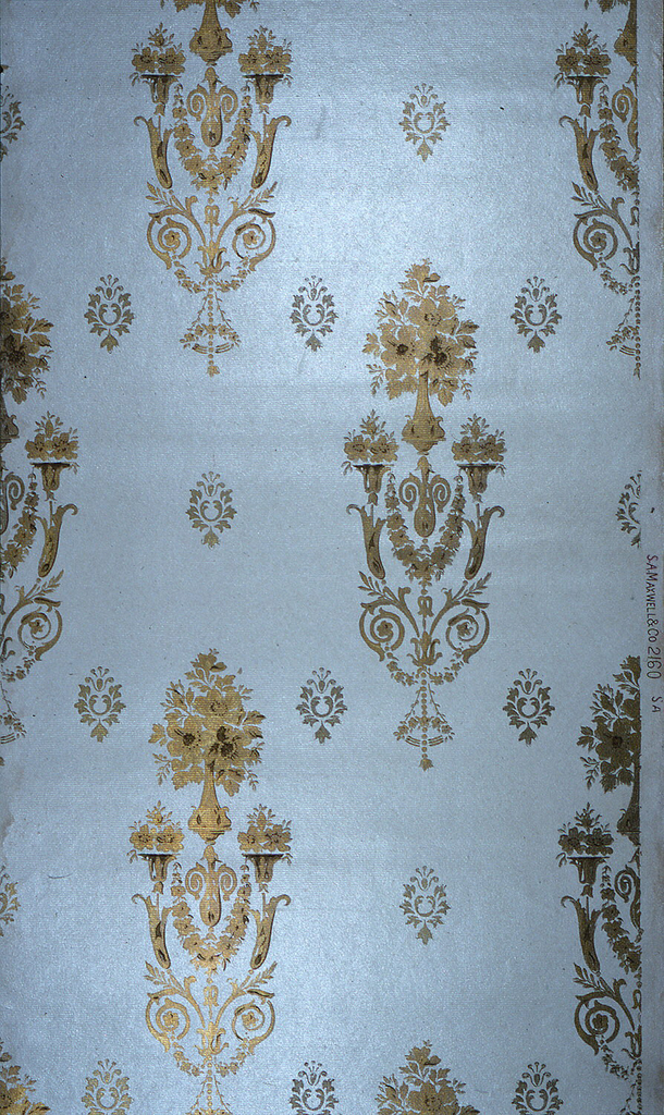This is a Sidewall. It was manufactured by Maxwell & Co., S.A.. It is dated 1905–1915 and we acquired it in 1979. Its medium is machine-printed paper, ribbed, liquid mica. It is a part of the Wallcoverings department.