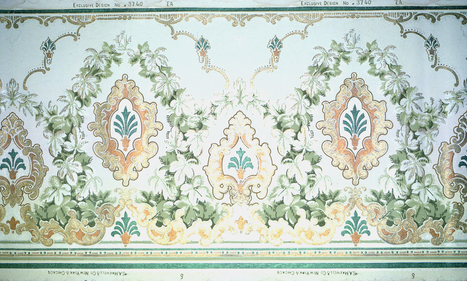 This is a frieze. It was distributed by Maxwell & Co., S.A.. It is dated 1905–1915 and we acquired it in 1979. Its medium is machine-printed paper, textured, liquid mica. It is a part of the Wallcoverings department.
