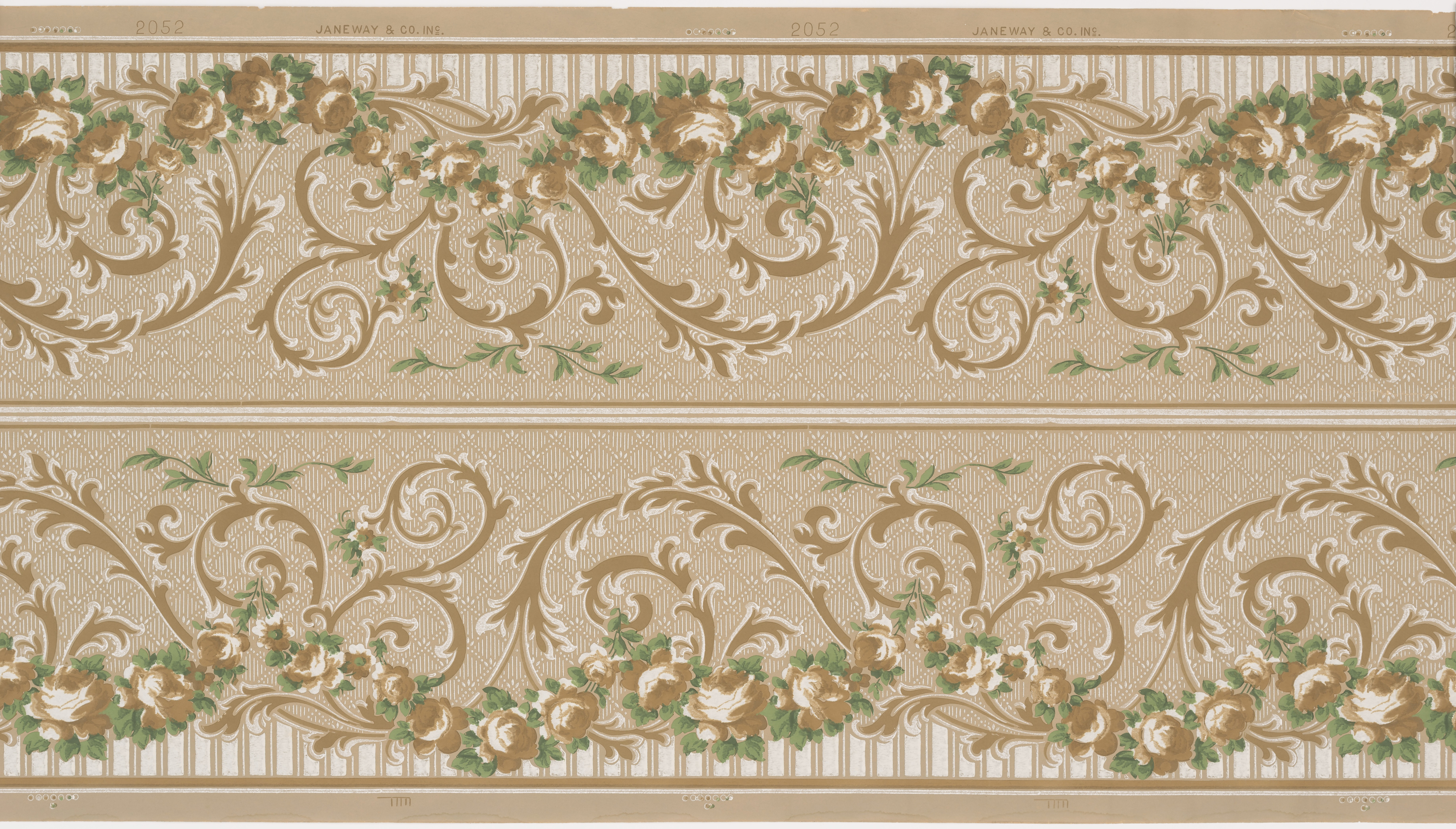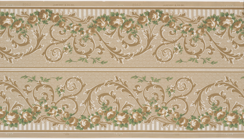 This is a frieze. It was manufactured by Janeway & Co. Inc.. It is dated 1905–1915 and we acquired it in 1979. Its medium is machine-printed paper. It is a part of the Wallcoverings department.