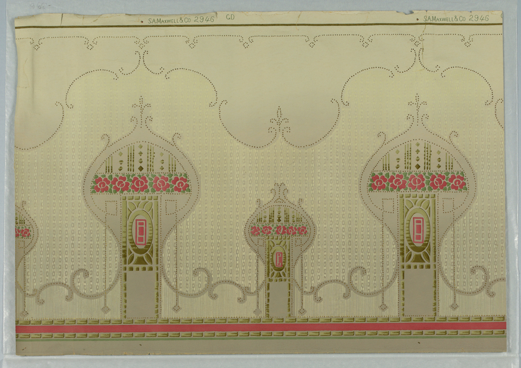 This is a frieze. It was manufactured by S.A. Maxwell & Co.. It is dated 1905–1915 and we acquired it in 1979. Its medium is machine-printed paper. It is a part of the Wallcoverings department.