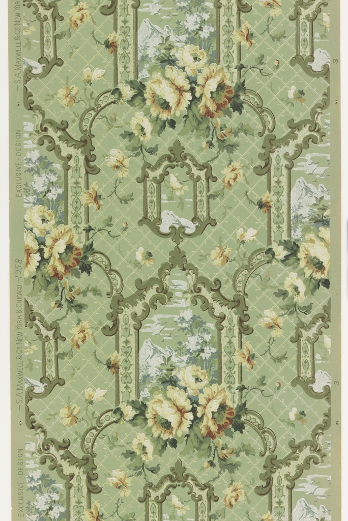 This is a Sidewall. It was manufactured by Maxwell & Co., S.A.. It is dated 1905–1915 and we acquired it in 1979. Its medium is machine-printed paper, liquid mica. It is a part of the Wallcoverings department.