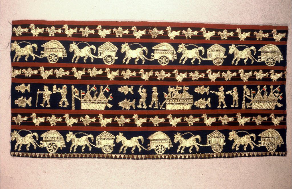 This is a Skirt panel. It is dated 1900–1980 and we acquired it in 1980. Its medium is cotton, silk, metallic threads and its technique is embroidered in couching stitches on plain weave. It is a part of the Textiles department.