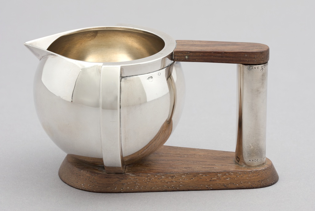 This is a creamer. It was designed by Jean Elysée Puiforcat. It is dated ca. 1928 and we acquired it in 1982. Its medium is silver, walnut. It is a part of the Product Design and Decorative Arts department.