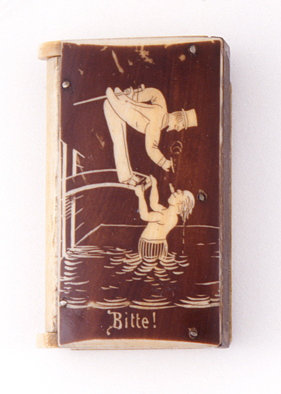 Gentleman and Swimmer Matchsafe; probably Germany; ivory; 6.1 x 3.8 x 1.5 cm (2 3/8 x 1 1/2 x 9/16 in. ); Gift of Stephen W. Brener and Carol B. Brener; 1982-23-128