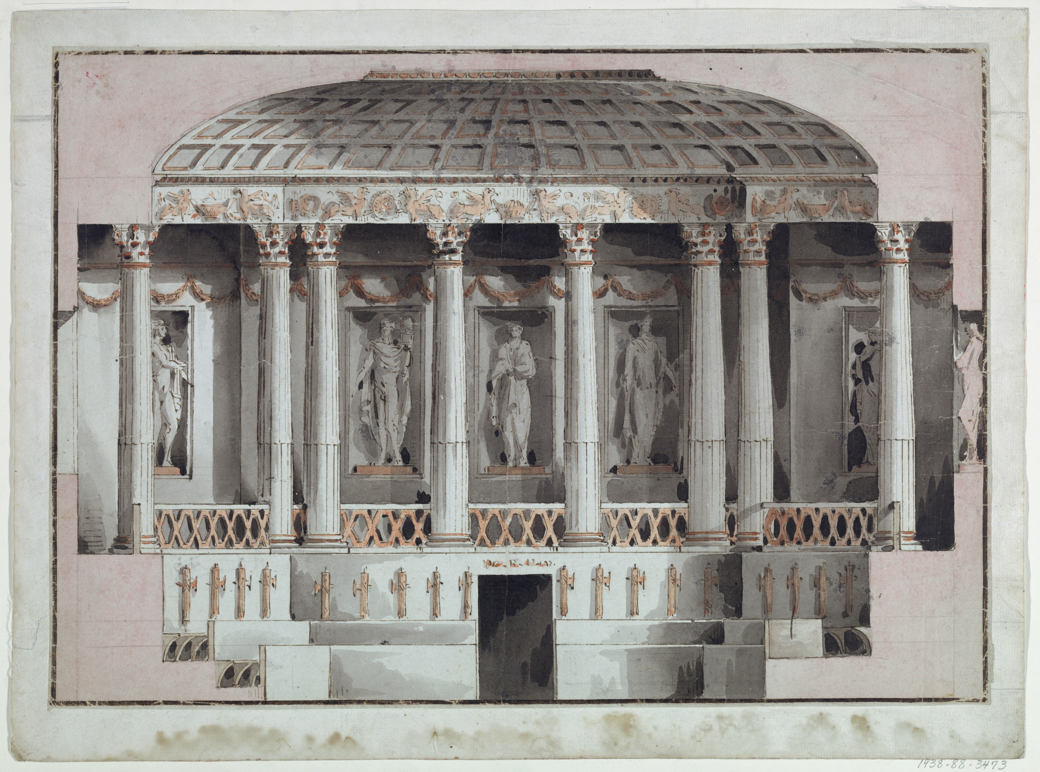 This is a Drawing. It was designed by Victor Louis. It is dated ca. 1765 and we acquired it in 1938. Its medium is pen and brown ink, brush and watercolor, black chalk on paper, lined. It is a part of the Drawings, Prints, and Graphic Design department.