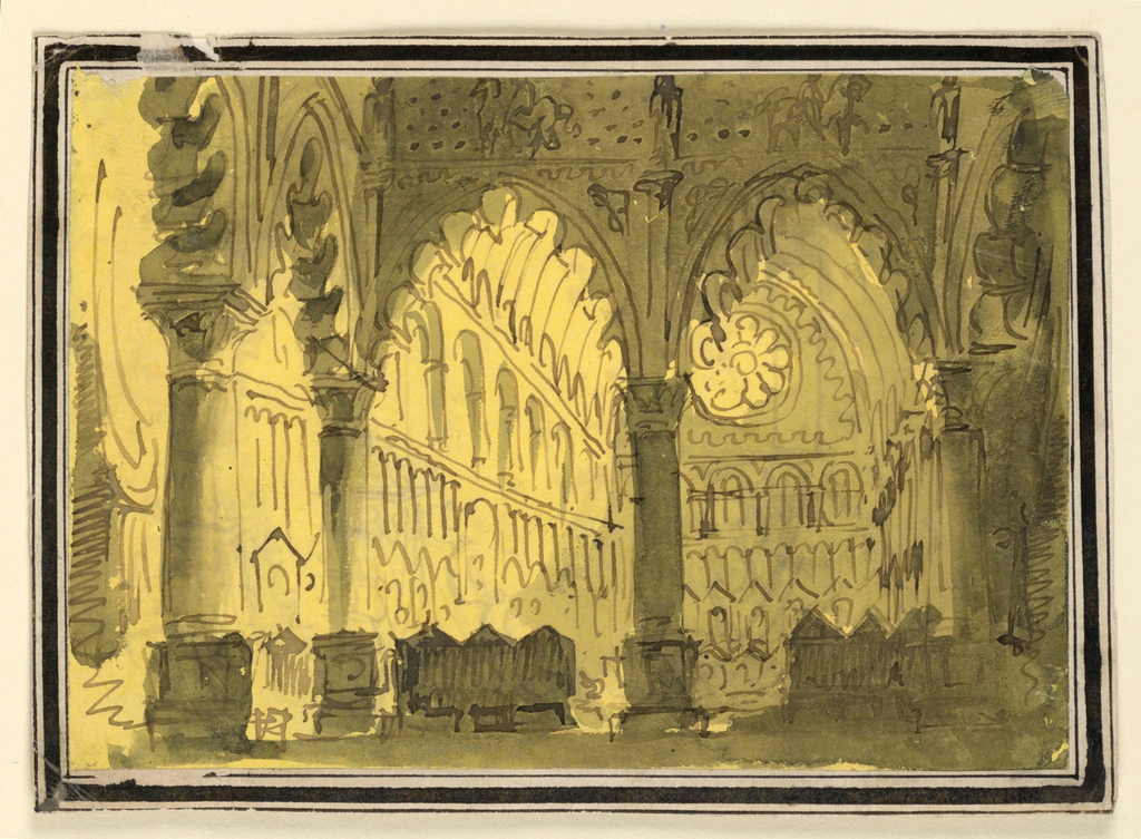 Drawing, Stage Design, Church Interior; Designed by Pietro Narducci (Italian, active 1809 - 1841); Italy; pen and sepia ink, brush and wash on paper; H x W: 10.3 × 14.8 cm (4 1/16 × 5 13/16 in.); Museum purchase through gift of various donors and from Eleanor G. Hewitt Fund; 1938-88-366