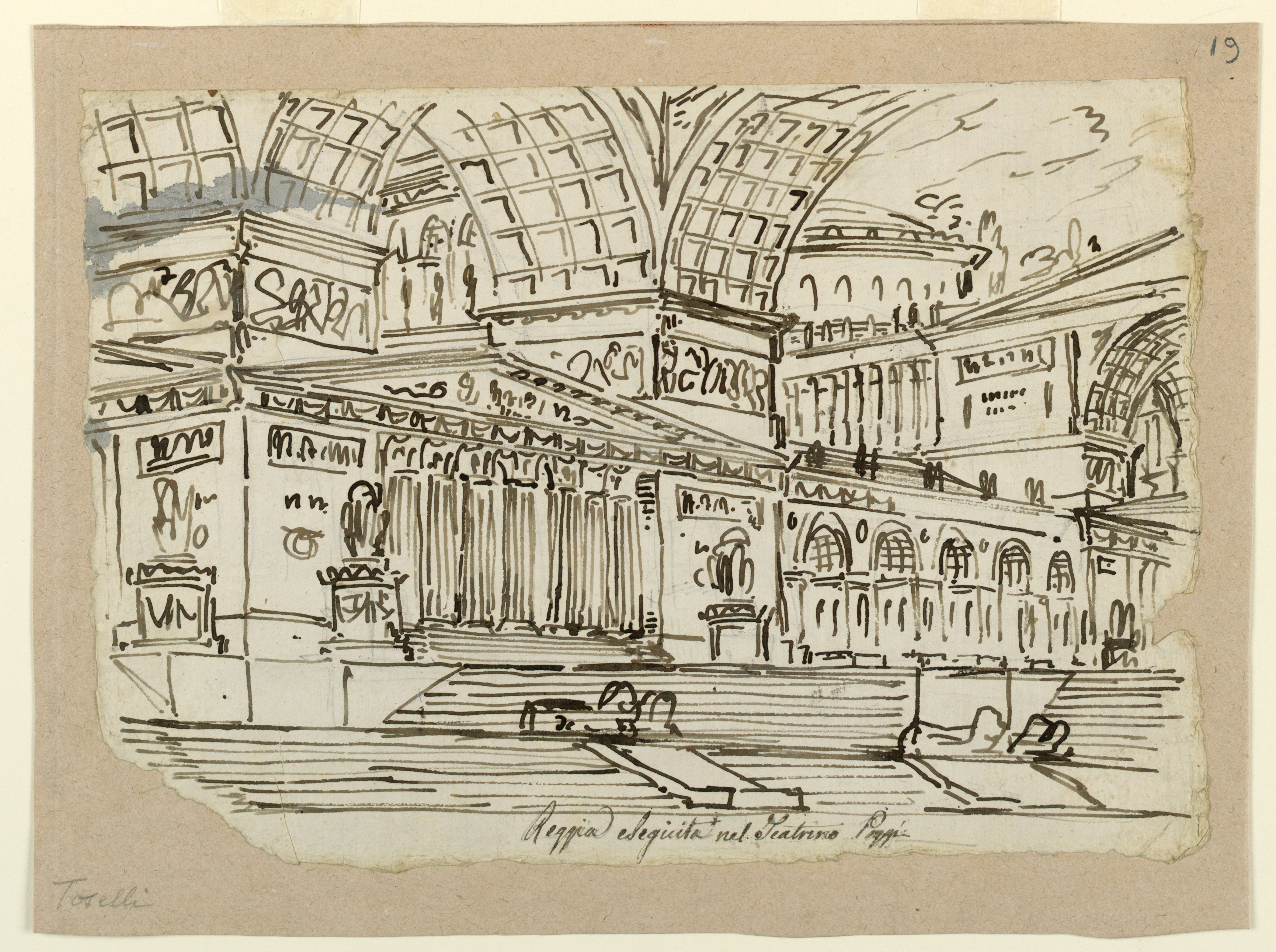 Inscribed in pen and brown ink, lower margin: Reggia esequita nel Teatrino Poggi (Palace of the King executed at the Theatre Poggi); in graphite, lower left corner of mounting sheet: Toselli